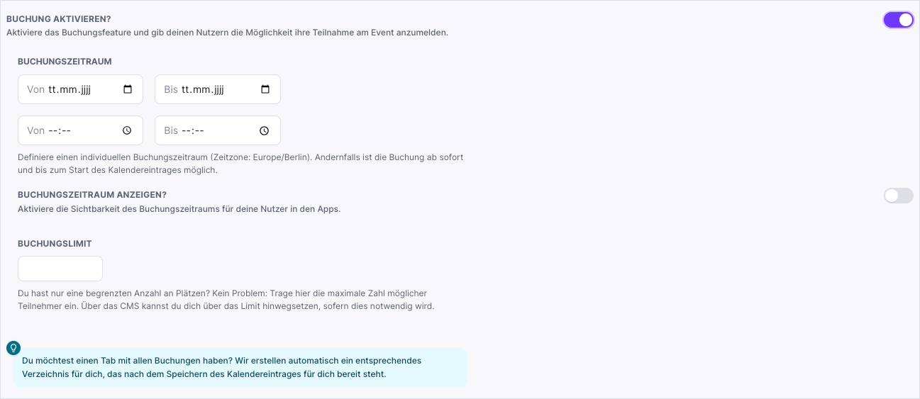 Hier kannst du für passende Kalendereinträge (z.B. Workshops, Führungen) das optionale Buchungsfeature einschalten. Es können der Zeitraum konfiguriert werden sowie ein Buchungslimit festgelegt werden.